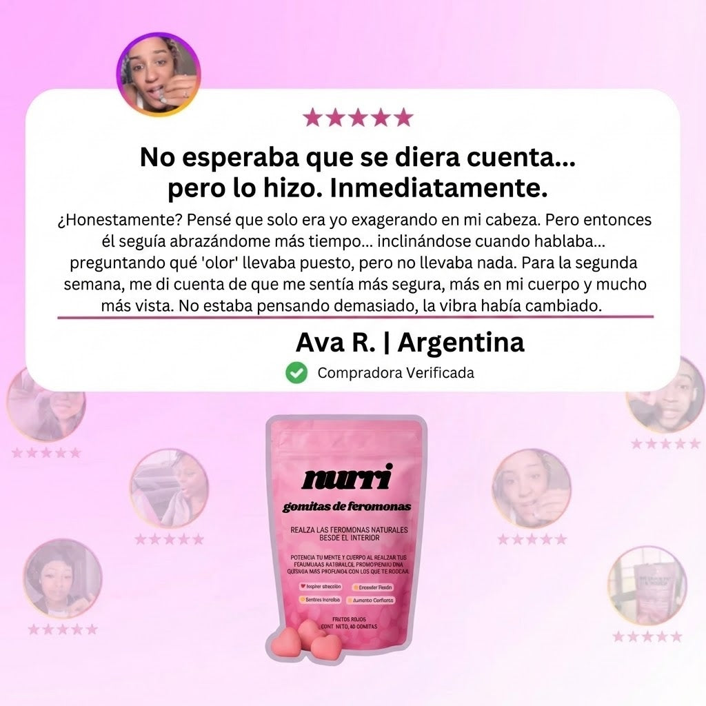 Nurri funciona estimulando la producción natural de feromonas del cuerpo. Si bien algunas personas notan cambios sutiles en la primera hora (como mejor estado de ánimo o confianza), la verdadera magia ocurre con el uso constante. En unos pocos días (se recomiendan de 7 a 10), el cuerpo comienza a amplificar sus propias señales naturales, lo que puede generar señales de atracción más fuertes y una química más profunda con quienes te rodean. No es un cambio instantáneo, sino una suave mejora de lo que ya llevas dentro.